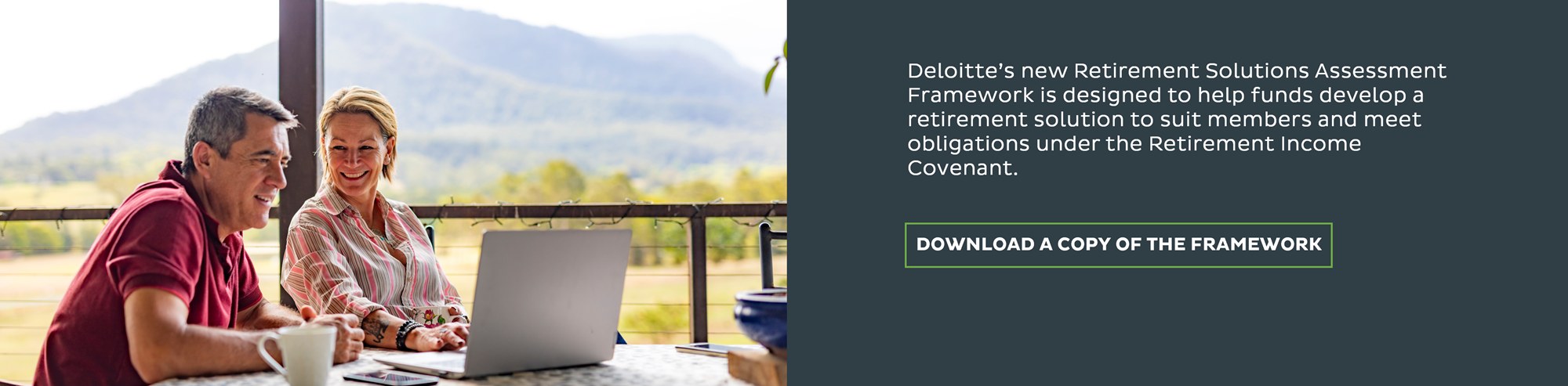 To assist with this, TAL has been proud to support the research and development of Deloitte’s new Retirement Solutions Assessment Framework. The Framework is designed to help funds develop a retirement solution to suit members and meet obligations under the Retirement Income Covenant and help to weigh up their options around product features, pricing, partners and other key criteria.