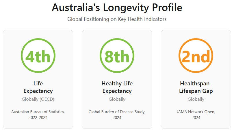 1 Based on a 20-year longitudinal analysis of WHO Global Health Observatory data across 183 countries, published in JAMA Network Open (2024). The study found Australia ranked second globally with a 12.1-year healthspan-lifespan gap (behind the US at 12.4 years), based on a life expectancy of 82.9 years and healthy life expectancy of 70.8 years at the end of the 20-year period.